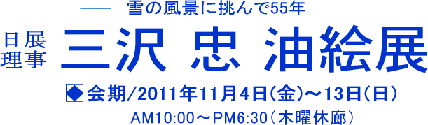 降りしきる雪や横なぐりの雪の中で、生きた雪を描きたいと絵筆をにぎります。 現場主義を貫く三沢先生の3回目の個展です。おおらかな浅間山、残雪の妙高、錦秋の志賀高原など迫力に満ちた作品をお楽しみ下さい。