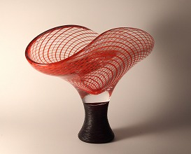 植木 寛子 ヴェネチアン・グラス 左から 赤い網目花器 h27cm・赤い靴 h39cm・波が上がる飛沫 h17cm・シルバーのボディ h57cm