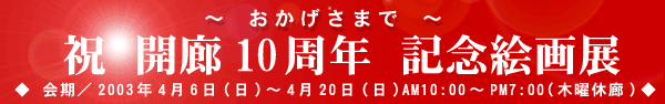 今ではご家族おそろいで気軽に美術を楽しめる憩いの場として多くの方々に親しまれております。この度10周年を迎えるにあたり、30名のすぐれた画家たちによる記念展を開催致します。どうぞお楽しみ下さい。 |