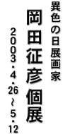 AM 10:00〜PM 19:00 (木曜休廊) 正統派的な画風の多い日展洋画部の中で、岡田征彦の作品は大胆な線と色面構成でひときわ異彩を放つ。一見荒削りに見える描線と絵膚は、見入る程に魅惑的で、一点一点の作品が如何に長い長い時を費やし、精魂をこめて描かれたかがわかる。また、えもいえぬしゃれた感覚は、8 年間のパリ留学で培われたものであろうか。現在、日展の評議員として活躍中の岡田画伯の作品を是非お楽しみ下さい。