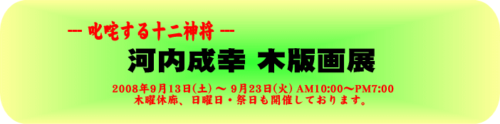 これらの十二神将図に接していると、天平時代(1200年以上前)の人々の願いが、「現代にこそ」 と実に新鮮に感じます。環境破壊や政治不信、マネーゲームなどなど、虚偽に満ちた利己的な現代社会を叱咤している様に思え、また激励し、護ってくれる様な気持になります。迫力と威厳に溢れ、仏教的な宇宙感に満ちた十二神将図をはじめ、見応のある作品30点を展示いたします。