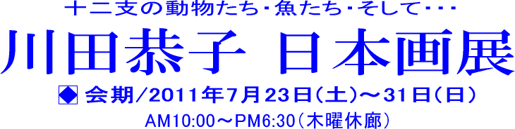 虫を愛してやまなかった「虫めずる姫」と云う話が平安時代にありました。日展会員の川田恭子さんはさしずめ現代の「魚めずる姫」「けものめずる姫」であろうか。水族館や動物園は勿論ブラジルまでも足を延ばして取材をしておられます。そして描かれた動物たちは実にユニークで、楽しそうに、時にはちょっと淋しそうに画面のなかで遊んでいます。作品をみていると作家の大自然への憧憬と。いきとし生けるものへのいとおしみの気持ちが強く感じられます。今回は12年にわたって描いて頂いた十二支の全作品をはじめ、さまざまな動物たちの楽しい絵がいっぱいです。是非ご高覧賜ります様ご案内申し上げます。暑い毎日です。ご自愛下さいます様。