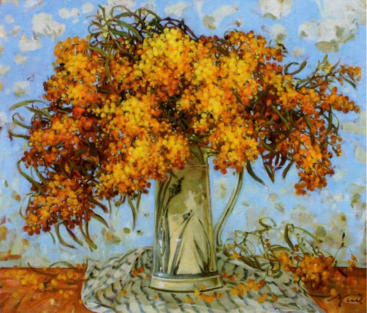 由比さんの描く花や風景は日本的な油絵とは少々異なる。優美で豊穣な色彩を軽やかなタッチで描くので、とてもお洒落で魅惑的である。