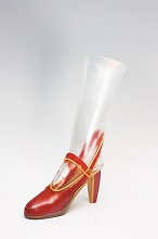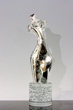 植木 寛子 ヴェネチアン・グラス 左から 赤い網目花器 h27cm・赤い靴 h39cm・波が上がる飛沫 h17cm・シルバーのボディ h57cm