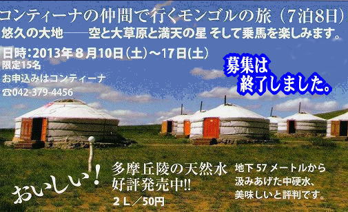 当ギャラリーコンティーナでは毎年旅の仲間を募っています。 この旅は、モンゴルの最もモンゴルらしい素晴らしさを満喫出来ます様企画した手作りの旅で、外国旅行を何度も体験している旅のベテラン達からも、今までで最高の旅だったと喜んで頂きました。